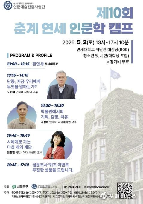 [ 포에버뉴스 김경순 기자 ] 서대문구가 연세대학교 문과대학과 공동으로 5월 2일 오후 1시부터 5시 10분까지 연세대 위당관 대강당(B09호)에서 ‘제10회 연세 인문학 캠프’를 개최한다.