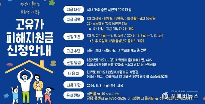 [ 포에버뉴스 김경순 기자 ] 의정부시는 중동전쟁으로 촉발된 고유가‧고물가로 인한 국민 부담을 경감하고자 ‘고유가 피해지원금’ 신청을 4월 27일부터 접수한다.