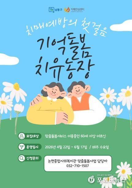[ 포에버뉴스 김경순 기자 ] 인천시 남동구보건소가 자연 속 농업 활동을 활용한 치매 예방 프로그램 ‘기억돌봄 치유농장’을 올해부터 정식 사업으로 확대 운영한다.