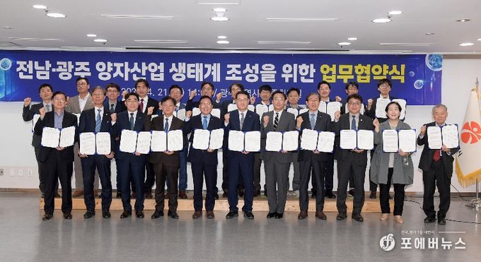광주광역시와 전라남도는 21일 시청 중회의실에서 대학, 연구기관, 기업 등 23개 기관이 참여하는 ‘광주·전남 양자산업 생태계 조성을 위한 업무협약식’을 개최했다.