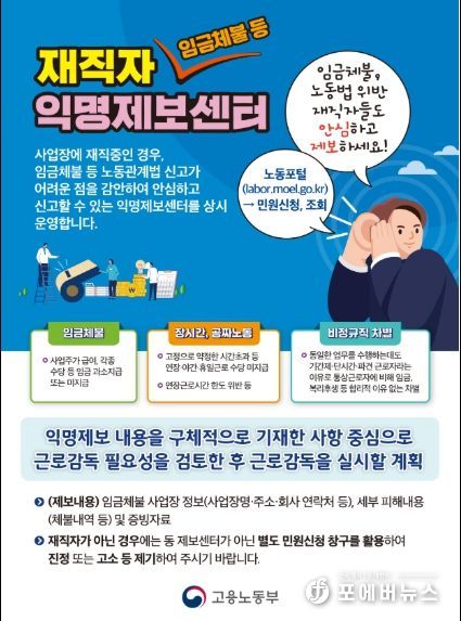 [ 포에버뉴스 사공선 기자 ] 고용노동부는 ‘숨어있는 체불’을 선제적으로 청산하고 포괄임금 오남용으로 인한 “공짜 노동”을 근절하기 위해 「재직자 익명제보 사업장 근로감독」을 4월 22일부터 약 2개월간 진행한다고 밝혔다.