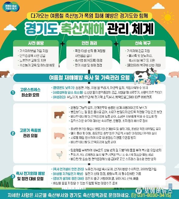 신종광 축산정책과장은 “기후 위기로 폭염이 일상화된 만큼 경기도는 농가와 협력해 선제적 방어 체계를 유지할 것”이라며 “면역증강제 지원과 재해보험 등 가용자원을 총동원해 축산농가가 안심하고 생업에 종사할 수 있도록 최선을 다하겠다”고 말했다.