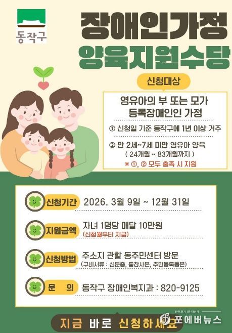 [ 포에버뉴스 김경순 기자 ] 동작구는 관내 장애인 가정의 경제적 부담을 완화하고, 안정적인 양육 환경을 조성하기 위해 올해부터 ‘장애인가정 양육지원수당’을 새롭게 지급한다고 밝혔다.