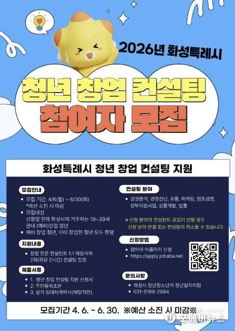 [ 포에버뉴스 김경순 기자 ] 화성특례시는 오는 6월 30일까지 ‘2026년 청년 창업 컨설팅 지원사업’ 참여자를 모집한다.