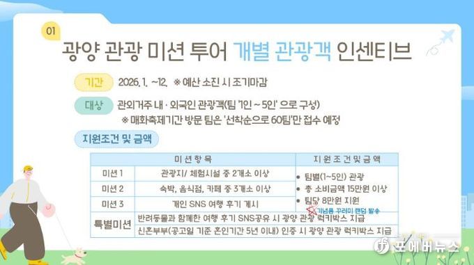 광양시 관계자는 “5월 황금연휴를 맞아 가족 단위 여행 수요가 늘어날 것으로 기대된다”며 “관광객이 혜택을 쉽게 활용할 수 있게 관련 정보를 적극 제공하고 체류형 관광 활성화에 힘쓰겠다”고 말했다.