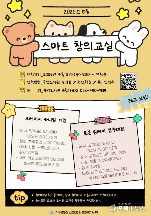 [ 포에버뉴스 김경순 기자 ] 인천광역시교육청주안도서관은 4월 29일부터 관내 초등학생을 대상으로 ‘5월 스마트창의교실’ 참여자를 모집한다.