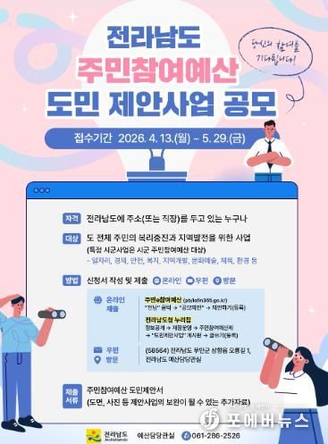[ 포에버뉴스 오명숙 기자 ] 전라남도는 2027년 예산 편성을 위한 주민참여예산 제안사업 공모를 5월 29일까지 진행한다고 밝혔다.