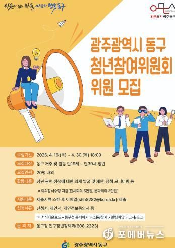 [ 포에버뉴스 오명숙 기자 ] 광주 동구는 청년이 정책의 수혜자를 넘어 정책의 주체로 참여하고, 지역 변화를 이끌어갈 ‘제6기 청년참여위원회’ 위원을 공개 모집한다고 밝혔다.