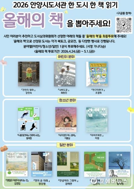 [ 포에버뉴스 김경순 기자 ] 안양시는 2026년 한 도시 한 책 읽기 ‘올해의 책’ 선정을 위한 시민 선호도 조사를 오는 5월 1일까지 온·오프라인으로 진행한다고 24일 밝혔다.