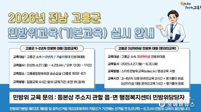 [ 포에버뉴스 오명숙 기자 ] 고흥군은 민방위대원의 대응 역량을 강화하고자 2026년 상반기 민방위 기본교육을 실시한다고 밝혔다.