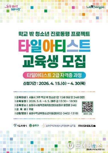 [ 포에버뉴스 김경순 기자 ] 송파구는 서울시 ‘약자와의 동행’ 공모사업으로 학교 밖 청소년들의 사회진입과 자립을 돕기 위한 ‘타일아티스트 교육’을 실시한다고 24일 밝혔다.