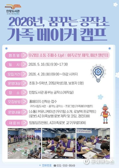 [ 포에버뉴스 김경순 기자 ] 구리시 인창도서관‘꿈꾸는 공작소’는 오는 5월 16일 초등학생 자녀와 보호자가 함께 참여해 가족 간 유대감을 높이고 인공지능을 체험하는 '우리 팀 소통 주파수 Up! : 이족로봇 제작, 미션 챌린지' 가족 메이커 캠프를 운영한다고 밝혔다.