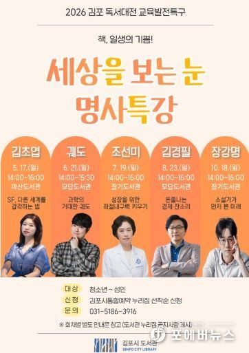 [ 포에버뉴스 김경순 기자 ] 김포시 도서관은 2026 김포 독서대전 교육발전특구 사업으로 '세상을 보는 눈, 명사특강'을 오는 5월 17일부터 10월 18일까지 5회에 걸쳐 관내 도서관 3곳에서 진행한다.