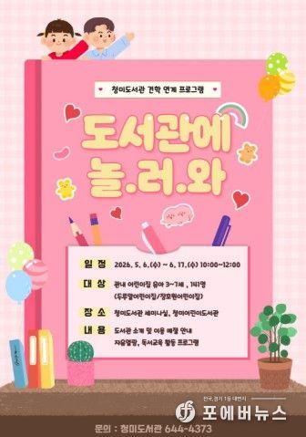 [ 포에버뉴스 김경순 기자 ] 이천시 청미도서관은 오는 5월 6일부터 6월 17일까지 관내 어린이집 유아를 대상으로 도서관 견학 연계 프로그램 ‘도서관에 놀.러.와’를 운영한다.