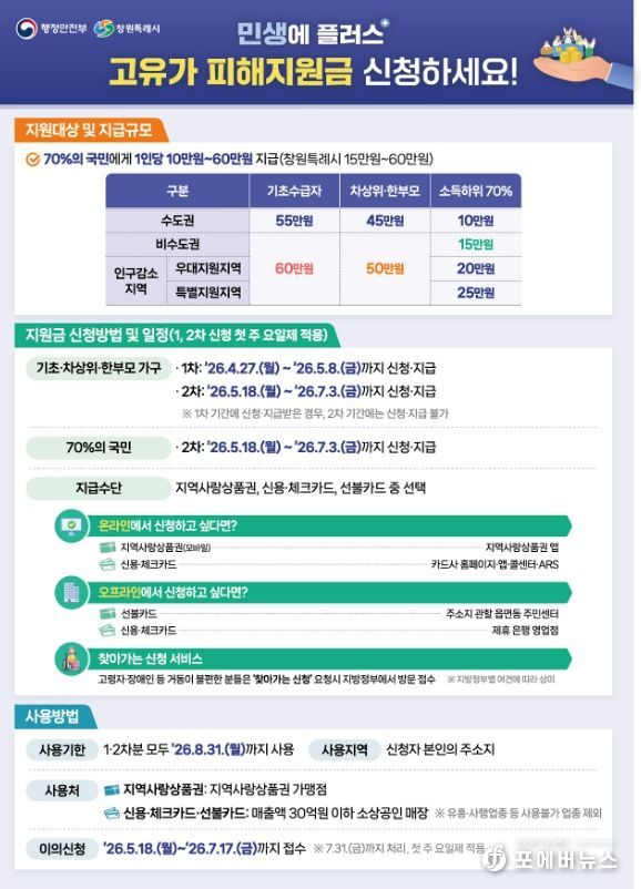 [ 포에버뉴스 사공선 기자 ] 고유가·고물가로 가중된 민생 부담을 덜기 위해 전국적으로 시행되는 ‘고유가 피해지원금’ 신청 첫날인 27일, 창원특례시 내 55개 읍면동 접수 창구에는 시민들의 지원금 신청 발길이 온종일 이어졌다.