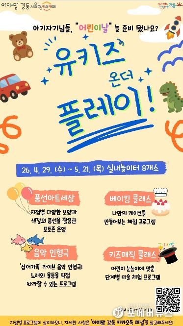 한편, 5월 5일 어린이날에는 강동구청 열린뜰과 강동어린이회관 일대에서 ‘2026 강동어린이대축제’가 열린다. ‘컬루와 친구들’ 축하공연을 시작으로 다양한 체험 프로그램과 공연, 참여형 놀이가 펼쳐진다. 특히, ‘장난감 순환마켓’에서는 강동구 장난감도서관에서 대여하던 상태 양호한 장난감 200여 점을 저렴하게 판매해 자원순환을 실천하고 가정의 경제적 부담을 덜어줄 것으로 기대된다.