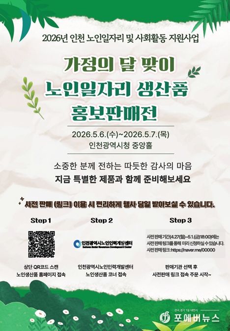 [ 포에버뉴스 김경순 기자 ] 인천시가 2026년 노인일자리 사업을 대폭 확대하고, 5월 가정의 달을 맞아 어르신들이 직접 제작한 생산품을 시민들에게 선보이는 홍보·판매 행사를 개최한다.
