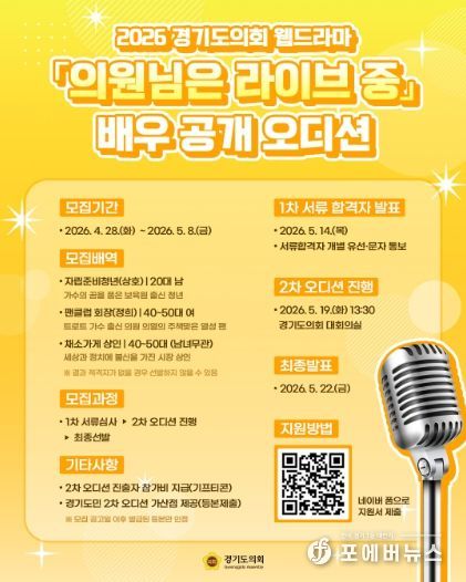 [ 포에버뉴스 김경순 기자 ] 경기도의회는 2026년도 경기도의회 웹드라마 ‘의원님은 라이브 중(가제)’에 출연할 배우를 공개 모집하기 위해 오디션을 개최한다.