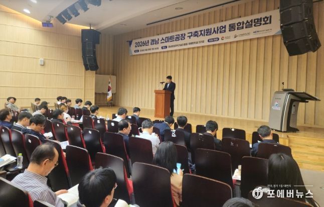 [ 포에버뉴스 사공선 기자 ] 경상남도는 28일 경남테크노파크 경남창원과학기술진흥원에서 ‘2026년 경남 스마트공장 구축 지원사업 통합 설명회’를 개최하고, 제조 인공지능(AI) 기반 스마트공장 보급·확산에 속도를 낸다고 밝혔다.