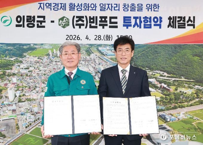 [ 포에버뉴스 사공선 기자 ] 의령군은 지난 28일 군수실에서 ㈜빈푸드(대표 홍효선)와 투자협약(MOU)을 체결했다고 밝혔다.