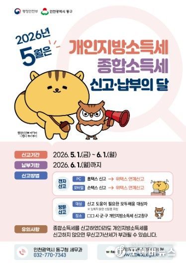[ 포에버뉴스 김경순 기자 ] 인천 동구는 2025년 귀속 종합소득세 확정신고 대상자인 경우 5월 1일부터 6월 1일까지 개인지방소득세와 종합소득세를 신고·납부해야 한다고 밝혔다.