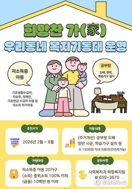 [ 포에버뉴스 오명숙 기자 ] 여수시는 저소득층 아동의 학습 여건 개선과 안전한 주거공간 조성을 위해 2026년 주거환경 개선사업 ‘희망찬 가(家)’를 추진한다고 밝혔다.