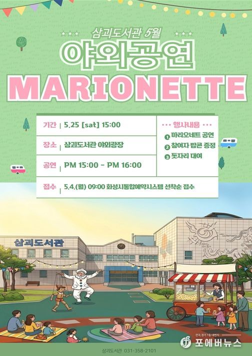[ 포에버뉴스 김경순 기자 ] 화성시립 삼괴도서관은 5월 가정의 달을 맞아 오는 5월 23일, 도서관 야외광장에서 가족 단위 이용자를 위한 특별한 문화행사를 운영한다. 따뜻한 봄날의 야외 공간에서 누구나 편안하게 즐길 수 있도록 마련된 이번 행사는 도서관을 찾는 시민들에게 색다른 문화 경험과 여유로운 시간을 제공할 예정이다.