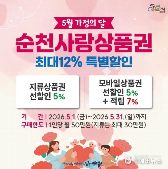 [ 포에버뉴스 사공선 기자 ] 순천시가 5월 한 달간 순천사랑상품권 특별 할인행사를 추진해 시민들의 가계 부담을 덜고 지역 소상공인에게 활력을 불어넣는 소비 촉진에 나선다.