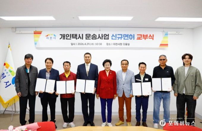 [ 포에버뉴스 김경순 기자 ] 이천시는 29일 시청 다올실에서 개인택시운송사업 신규 면허증 교부식을 개최하고, 심사를 통해 최종 선정된 5명의 대상자에게 면허증을 전달했다고 밝혔다.