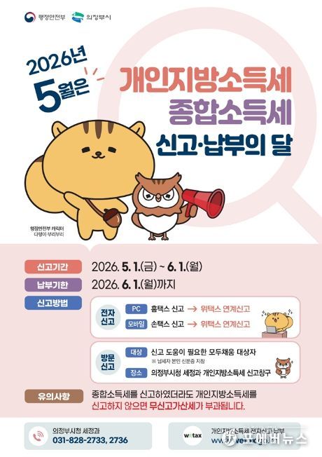 [ 포에버뉴스 김경순 기자 ] 의정부시는 5월 개인지방소득세 및 종합소득세 확정신고 기간을 맞아, 5월 6일부터 6월 1일까지 시청 본관 세무민원실에 신고 도움창구를 운영한다.