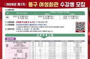 [ 포에버뉴스 김경순 기자 ] 인천 동구는 2026년 1월9일까지 ‘2026년 제1기 동구 여성회관 수강생’을 모집한다고 밝혔다. 2026년 1월2일부터 3개월 과정으로 진행되는 제1기 정규강좌 프로그램은 수강생들로부터 자격증 취득과 취업을 이끌어내 호평을 받은 실내인테리어(도배 및 필름) 등의 자격증 취득 프로그램과 어반스케치, 민화 그리기를 포함한 요리·공예 프로그램 등 총 26개 과정으로 운영된다. 특히 2025년 많은 수강생이 커피 바리스타 2급을 취득한 기존 커피 바리스타 강좌에 신규로 야간 강좌까지 추가되어 카페 취업이나 창업에 도움이 될 수 있도록 했다. 또한 한식 디저트 만들기 강좌와 장 담그기, 전통 헤어 강좌는 실생활 활용도가 높은 프로그램으로, 1개월 단기 특강으로 운영해 주민들이 부담 없이 참여할 수 있도록 구성했다. 일일 무료 특강으로는 일일민화그리기 특강과 커피 원데이 클래스가 준비됐다. 수강 신청은 인천 거주자를 대상(동구 주민 우선)으로 여성회관 홈페이지를 통해 선착순 접수하며, 온라인 접수에 불편을 겪는 분이나 동구사랑상품권·평생교육 바우처 사용자는 여성