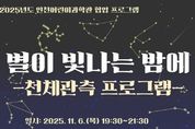 [ 포에버뉴스 김경순 기자 ] 인천광역시교육청주안도서관은 인천어린이과학관과 함께 초등 저학년 가정을 대상으로 한 천체 관측 프로그램 ‘별이 빛나는 밤에’ 참가자를 모집한다. 이번 프로그램은 지난해 체결된 인천어린이과학관과의 업무협약에 따라 진행되는 협업 사업으로, 11월 6일 오후 7시 30분부터 9시 30분까지 주안도서관 평생학습 1실과 야외에서 진행된다. 참가자들은 ▲천문 이론 및 별자리 설화 ▲별자리 LED 무드등 만들기 ▲달·행성 등 천체 관측 등 별자리 이야기와 이론 학습부터 실제 천체 관측까지 다채로운 활동을 체험할 수 있으며, 우천 시 3D 가상천체 관측 프로그램으로 대체된다. 10월 21일(화) 오전 10시부터 주안도서관 누리집에서 온라인으로 참가신청이 가능하며, 초등 1~3학년과 보호자 등 20팀을 선착순 모집한다. 자세한 내용은 주안도서관 누리집 또는 독서문화과로 문의하면 된다.