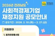 [ 포에버뉴스 오명숙 기자 ] 전라남도는 오는 27일까지 사회적경제기업의 지속적이고 안정적인 성장과 자립을 지원하기 위한 2026년 사회적경제기업 재정지원사업 공모를 추진한다. 이번 공모는 ▲일자리창출 지원 ▲사업개발비 지원 ▲시설장비 지원 ▲시군 지역 특화사업 지원, 4개 분야로 나눠 530여 기업에 총 49억 원을 지원할 예정이다. 지난해(27억 원)보다 대폭 확대된 규모다. 특히 올해는 기업 선호도가 높은 인건비에 국비 지원이 재개되고, 도 자체 지원도 확대해 기업의 고용 부담을 완화하고 안정적 일자리 창출을 적극 지원할 방침이다. 일자리창출사업은 진입 초기 사회적기업을 대상으로 취약계층 고용 1명당 월 50만~90만 원을 최대 3년간 인건비로 지원하며, 도 자체 지원사업인 전남형 일자리창출사업은 일반인력과 전문인력까지 추가로 지원한다. 사업개발비 사업은 사회적경제기업의 제품 품질개선, 디자인과 시제품 제작, 홍보비 등 최대 1억 원을 지원한다. 시설장비 사업은 기업이 신규 시설장비를 구입하거나 노후 시설장비 교체 시 최대 2천만 원을 지원한다. 이외에도