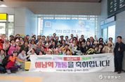 [ 포에버뉴스 오명숙 기자 ] 땅끝해남에 철도시대가 열렸다. 전남 서남해안 권역을 연결하는 보성~목포 철도가 27일 개통했다. 27일에는 신설된 해남역에서 철도 개통을 축하하는 기념행사가 개최됐다. 오전 8시 2분 목포역을 출발해 31분만에 해남에 도착한 새마을호의 첫 방문객에게 꽃다발 증정한데 이어 오전 7시 48분 부산을 출발해 낮 12시 25분 해남에 도착한 남도해양관광열차(S-train) 단체여행객을 대상으로 환영식이 진행됐다. 단체 여행객은 해남군의‘열차타고 코리아둘레길 걷기 여행’참가자들로, 9월 27일부터 28일까지 1박2일 해남에서 서해랑길 트레킹 프로그램에 참가한다. 명현관 군수는“부산에서 기차를 타고 오신 관광객들을 해남역에서 맞이하게 되어 감개무량하다”며“앞으로 기차를 통해 영호남, 나아가 전국을 잇는 땅끝 해남의 새로운 관광시대가 열리게 될 것”이라고 전했다. 해남군은 ‘사통팔달 교통망 확충’을 통해 땅끝해남이라는 지리적 불리함을 극복하기 위해 철도·고속도로·지방도 확장 등에 속도를 높이고 있다. 이번 철도 개통으로 남해안 권역 철도망이