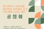 [ 포에버뉴스 오명숙 기자 ] 광주광역시는 23일 오후 4시 광주광역시의회 5층 예결위회의실에서 ‘광주광역시 시민사회 활성화와 공익활동 증진을 위한 기본계획(제1차, 2026~2028)’ 최종보고회 겸 공청회를 개최한다. 광주시가 주최하고 광주시민사회지원센터가 주관하는 이번 공청회는 향후 3년간 광주 시민사회의 지속가능한 발전을 위한 정책방향을 최종 확정하기 전 시민사회 현장의 의견을 수렴하기 위해 마련됐다. 광주시는 2023년 ‘광주광역시 시민사회 활성화와 공익활동 증진 조례’를 제정하고, 2024년 7월 기존 ‘광주NGO지원센터’를 ‘광주시민사회지원센터’로 전환하며 시민사회 지원 기반을 확대했다. 올해는 전문가-행정-센터가 참여하는 ‘기본계획수립 전담팀(TF)’을 구성해 본격적인 연구에 착수했다. 전담팀(TF)은 지난 4월부터 수차례 논의와 자문을 거쳐 기본계획의 기틀을 마련했으며, 시민 및 시민사회 설문조사, 활동가 직급별 포커스그룹인터뷰(FGI) 결과를 반영해 비전과 목표, 추진전략을 구체화했다. 이번에 공개되는 기본계획은 ▲시민사회 기반과 역량 강화 ▲시민참여와 활동가 저변 확대 ▲공익활
