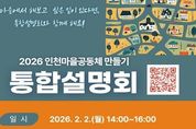 [ 포에버뉴스 김경순 기자 ] 인천광역시는 2월 2일 제물포스마트타운 2층 대강의실에서‘2026년 인천광역시 마을공동체 만들기 통합설명회’를 개최한다고 밝혔다. 이번 설명회는 마을공동체 관계자와 활동가, 일반 시민 등 약 150명이 참석할 예정으로, 인천시와 군·구가 추진하는 마을공동체 공모사업과 주요 지원 정책을 한자리에서 소개해 시민들의 사업 참여를 확대하기 위해 마련됐다. 인천시는 올해 제3기 마을공동체 만들기 기본계획(2026~2030)을 수립하고, ‘시민과 함께, 자치와 연대로 성장하는 인천 마을공동체’를 비전으로 설정했다. 이는 주민이 스스로 의제를 발굴하고 실행하는 자치와 공동체 간 상생과 연대를 통해 마을공동체가 단발성 사업을 넘어 시민의 삶과 도시문화 속에 지속적으로 자리 잡도록 하겠다는 취지를 담고 있다. 설명회 1부에서는 인천시가 직접 기획해 추진하는 ▲네트워크 활성화 ▲마을 홍보 ▲세대 공감 ▲마을길 잇기 ▲기타 주민제안 등 5개 유형의 기획 공모사업을 소개한다. 이와 함께 마을지원활동가 운영, 교육, 공론장, 성과공유회 등 마을공동체의 성장을 지원하는 주요 프로