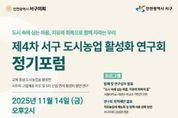 [ 포에버뉴스 김경순 기자 ] 인천 서구의회 《서구 도시농업 활성화 연구회》는 14일 오후 2시, 서구청 대회의장에서 제4차 정기포럼을 개최한다. 이번 정기포럼 주제는‘도시 속에 심는 마음, 치유와 회복으로 함께 자라는 우리’로 발제는 서울대학교 이성우 책임연구원이 맡는다. 그동안 연구단체는 치유와 힐링의 도시농업 연구에 따른 자연친화, 환경회복 도시환경 조성을 주제로 연구 활동을 지속해 왔다. 전국 우수사례 현장 견학 13회와 정책 연구용역 2건을 진행했고, 포럼과 세미나를 3차례 개최했다. 이번 보고회는 그간의 왕성한 활동을 통해 얻어진 연구 성과의 최종 발표로 도시농업에 관심이 많은 구민들의 기대를 모으고 있다. 특히 이번 행사는 부대 프로그램도 함께 열려 더욱 풍성하다. ‘도시농업으로 만드는 치유와 회복의 여정’ 연구활동 성과와 참여 기관의 치유농업 성공 사례 성과물도 함께 전시한다. 이번 정기포럼에 대해 김남원 대표 의원은 “3년 동안의 단일 주제로 연구 활동을 해왔다”, “2023년 처음 활동 당시 의원님 그대로 열과 성의를 다해 동참해 주신 결과의