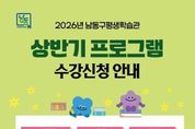 [ 포에버뉴스 김경순 기자 ] 인천시 남동구 평생학습관은 구민의 자기 계발과 지적 성장을 위해 오는 24일부터 ‘2026년 상반기 평생학습 프로그램’ 학습자를 모집한다고 20일 전했다. 상반기 프로그램은 3~5월까지 운영되며, 일상의 활력을 더하고 실질적인 역량을 강화할 수 있는 실용적인 강좌들로 꾸려졌다. 특히, ‘2025년 평생교육 강사학교’ 과정을 이수한 강사들이 지역사회와 시민의 삶을 주제로 직접 기획⋅개발한 강좌들이 다수 개설됐다. 주요 강좌로는 ▲남동구의 색(色)다른 이야기 ▲나의 감정을 안아주는 예술이야기 ▲생성형 AI로 만드는 나의 영상 콘텐츠 ▲그림책과 공예 테라피로 나를 찾는 ‘다시, 봄’ 등 모두 4개 과정이 운영된다. 이와 함께 전 연령층의 학습 수요를 반영한 다양한 강좌도 운영된다. ▲시니어(65+) 스마트폰 입문 클래스 ▲바리스타 2급 자격과정 ▲오뒷세우스 깊게 읽기 ▲장애인과 비장애인이 함께하는 생태탐방 등 실용성과 인문적 소양을 아우르는 프로그램이 준비돼 있다. 수강 신청은 남동구평생학습관 홈페이지에서 선착순으로 진행되며, 남동구민 또는 남동구
