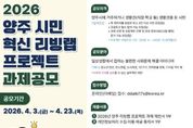 [ 포에버뉴스 김경순 기자 ] 양주시가 시민이 일상에서 겪는 사회문제를 직접 발굴하고 해결 방안을 모색하는 ‘2026년 양주 시민 혁신 리빙랩 프로젝트’ 공모를 오는 23일까지 진행한다. 이번 공모는 시민 참여를 기반으로 지역사회 문제 해결 방안을 도출하기 위해 마련됐다. 양주시에 거주하거나 직장·학교 등 생활권을 둔 시민이면 누구나 참여할 수 있다. 참여는 주제안자를 포함한 4인 이상으로 구성된 팀 단위로 가능하며, 공감토크(현장심사)와 과제 선정 이후 진행되는 워크숍, 성과공유회(12월 예정) 등에 참여해야 한다. 공모 주제는 청소년·청년, 탄소중립, 도시재생, 1인 가구, 반려동물 문화, 디지털 격차 등 지역사회가 직면한 다양한 사회문제 해결과 관련된 아이디어다. 접수된 제안은 사회적 가치와 효과성·창의성, 실현 가능성 등을 기준으로 제안심사실무위원회 심사와 공감토크 현장심사를 거쳐 최종 과제로 선정된다. 최종 선정된 2개 팀은 5월부터 11월까지 약 7개월간 퍼실리테이터(활동촉진자)와 함께 워크숍에 참여하며, 문제 정의부터 개선 방향 도출, 시범사업 추진까지 단계별 프로젝트를