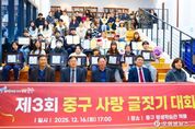 [ 포에버뉴스 김경순 기자 ] 인천 중구의회는 12월 16일, 중구 평생학습관에서 개최된 제3회 중구사랑 글짓기 대회 시상식에 참석해 수상자들을 축하했다고 밝혔다. 이날 시상식에는 강후공 의원이 참석해 수상자들에게 축하 인사를 전하고, 참여 학생들과 관계자들을 격려했다. 강후공 의원은 “이번 대회를 통해 지역에 대한 이해와 자긍심이 자연스럽게 형성되고, 올바른 가치관과 표현력을 기르는 계기가 되길 바란다”라며 “중구의회도 지역 정체성과 공동체 의식을 높이는 다양한 문화·교육 활동을 지속적으로 응원하겠다”라고 밝혔다. 또한 앞으로도 주민 참여형 문화·교육 행사를 적극 지원하고, 지역사회와 소통하는 의정활동을 이어갈 계획이라고 말했다.