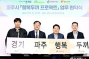 [ 포에버뉴스 김경순 기자 ] 파주시는 ㈔딜로이트한마음나눔, 행복나래㈜, 행복도시락 사회적협동조합과 함께 결식 우려가 있는 외국인 노동자 자녀 지원을 위한 ‘행복두끼 프로젝트’업무협약을 체결했다고 밝혔다. 이날 협약식에는 최병갑 파주시 부시장을 비롯해 ㈔딜로이트한마음나눔 유병문 상임이사, 행복나래㈜ 조민영 본부장, 행복도시락 사회적협동조합 최준 사무국장 등 관계자들이 참석해, 아동복지 향상을 위한 상호 협력체계를 구축하기로 뜻을 모았다. 이번 협약을 통해 파주시는 결식 우려 아동을 추천하고, ㈔딜로이트한마음나눔, 행복나래㈜와 행복도시락 사회적협동조합은 해당 아동을 대상으로 도시락을 후원·제작·배송하는 역할을 맡게 된다. 이번 협약을 계기로 파주시 내 결식이 우려되는 외국인 노동자 자녀 40명이 지원을 받게 됐으며, ‘아프리카 10개국 이주민 노동자 공동체’는 해당 아동들이 정기적으로 도시락을 제공받게 된 것에 대해 깊은 감사의 마음을 전했다. 최병갑 파주시 부시장은 “파주시가 행복두끼 프로젝트 사업에 참여하게 되어 뜻깊다”라며 “앞으로도 지역사회 내 어려움을 겪는 아동들에게 희망을 전하는 따뜻한