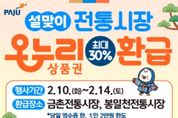 [ 포에버뉴스 김경순 기자 ] 파주시는 2026년 설 명절을 맞아 고물가로 인한 시민들의 가계 부담을 덜고 지역 전통시장 활성화를 도모하기 위해 ‘설맞이 농축산물 온누리상품권 환급 행사’를 실시한다. 이번 행사는 농림축산식품부가 주관하는 ‘농축산물 할인지원’사업의 일환으로, 본격적인 제수용품 구매 기간인ق월 10일부터 14일까지 5일간 관내 전통시장 2곳(봉일천전통시장, 금촌전통시장)에서 진행된다. 행사 기간 동안 참여 점포에서 국산 농축산물을 구매한 고객은 구매 금액에 따라 1만 원 또는 2만 원 상당의 온누리상품권을 환급받을 수 있다. 환급 기준은 ▲구매 금액이 3만 4천원 이상 6만 7천 원 미만일 경우 1만 원 ▲6만 7천 원 이상일 경우 2만 원이며, 환급 한도는 1인당 최대 2만 원이다. 단, 예산 소진 시 행사는 조기 종료될 수 있다. 환급을 희망하는 고객은 당일 구매 영수증과 신분증을 지참해 각 시장 내에 마련된 지정 환급처를 방문하면 된다. 환급 대상 품목은 국산 농산물 및 축산물이며, 수입산 농축산물이나 법인카드 결제 내역, 제로페이 모바일 상품권 결제 내역 등은 환급 대상에서