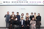 [ 포에버뉴스 김경순 기자 ] 평택시의회 의원 연구단체인 ‘평택시 청년정책연구회’는 17일 시의회 간담회장에서 최종보고회를 개최했다. 보고회에는 김산수 대표의원을 비롯해 김혜영·이기형·유승영 의원과 외부 전문가 회원, 청년정책과장 등 약 15명의 관계자가 참석했으며 연구용역을 맡은 더가능연구소 정현미 수석연구원으로부터 연구용역 최종보고를 청취하고 질의응답 시간을 가졌다. 주요 내용으로 △중앙정부 및 경기도 청년정책 주요 방향 △청년친화도시 지자체 정책의 시사점 △청년친화도시 조성을 위한 정책 제안 △평택시 청년친화도시 추진 방향 등에 대해 청취 후, 참석자들 간 여러 의견을 교환했다. 김산수 대표의원은 “올해 연구회 활동은 오늘로 마무리 되지만 많은 청년들이 평택시에서 일하고·놀고·살고 싶게 만드는 청년정책의 근본적인 시스템 구축의 시작점이기도 하다”며 “향후 청년친화도시 지정을 위하여 청년의 목소리를 중심에 두고 부족한 부분을 보완하며, 청년이 머물고 성장할 수 있는 정책 기반을 마련하기 위해 계속 관심을 가지고 지원하겠다”고 말했다. 한편, 해당 연구회는 ‘평택시 청년친화도시 조성을 위한 정책