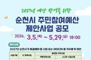 [ 포에버뉴스 오명숙 기자 ] 순천시는 2027년도 예산편성 과정에 시민의 다양한 의견과 아이디어를 반영하기 위해 3월부터 5월까지 주민참여예산 제안사업을 접수한다고 밝혔다. 주민참여예산제는 시민이 직접 지역에 필요한 사업을 제안하고, 이를 예산에 반영함으로써 재정 운영의 투명성과 민주성을 높이는 제도이다. 시민의 시각에서 생활 속 불편사항을 발굴하고, 지역 현안 해결을 위한 정책을 제안할 수 있다는 점에서 실질적인 참여 행정의 대표제도로 자리매김하고 있다. 순천시는 2021년부터 24개 읍면동 주민자치회를 전면 시행해 왔으며, 주민참여예산제를 통해 생활밀착형 사업과 지역 현안 사업을 지속적으로 발굴·추진해 왔다. 그 결과 소규모 생활환경 개선, 지역특화사업, 지역돌봄 및 역량강화 사업 등 시민 체감도가 높은 사업들이 다수 반영됐다. 이번 공모는 순천시에 주소를 두거나 생활권을 두고 있는 시민 누구나 참여 가능하며, ▲생활 불편해소 ▲지역 공동체 활성화 ▲돌봄․안전·환경 개선 등 시민의 일상과 밀접한 다양한 분야의 사업을 자유롭게 제안할 수 있다. 접수된 사업은 관련 부서