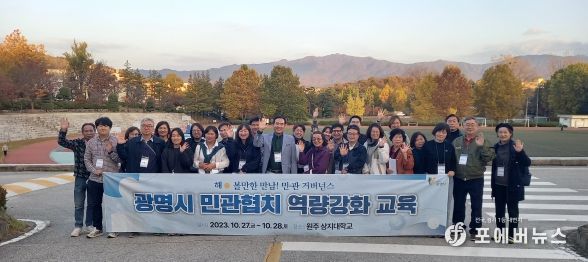 [ 포에버뉴스 김경순 기자 ] 광명시는 지난 27일과 28일 이틀간 강원도 원주시 상지대학교에서 민관협치위원과 공무원 60여 명이 참여한 가운데 ‘2023 광명시 민관협치 역량강화 워크숍’을 진행했다.