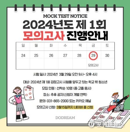 [ 포에버뉴스 김경순 기자 ] 동두천시 학교밖청소년지원센터는 2024년도 제1회 검정고시에 응시하는 학교 밖 청소년을 대상으로 ‘제1회 꿈드림 모의고사’를 실시한다.