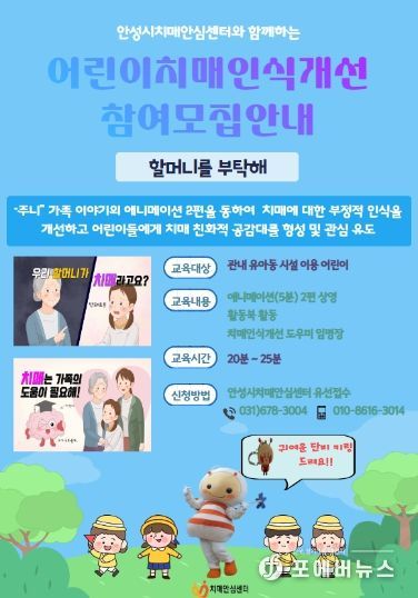 [ 포에버뉴스 최진성 기자 ] 안성시보건소 치매안심센터는 치매에 대한 긍정적 인식 확대 및 인식개선의 중요성 확산을 위해 관내 유․아동시설 어린이를 대상으로 오는 4월부터 치매인식개선 교육을 실시한다고 밝혔다.