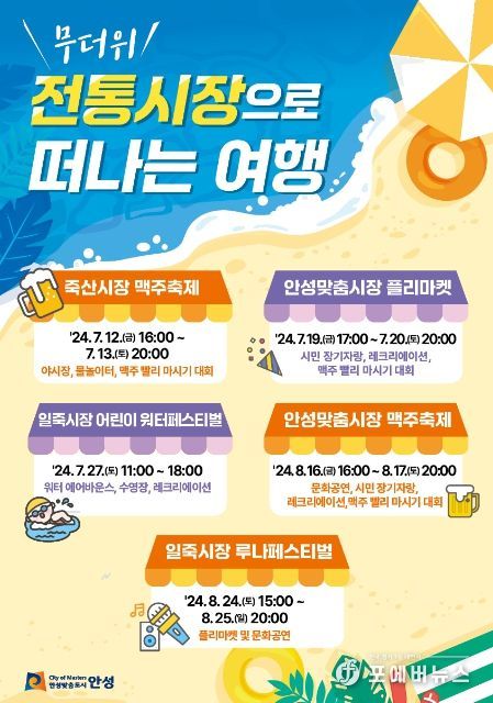 오는 7월 12~13일 죽산시장 맥주축제를 시작으로, 7월 19~20일 안성맞춤시장 플리마켓, 7월 27일 일죽시장 어린이 워터페스티벌, 8월 16~17일 안성맞춤시장 맥주축제, 8월 24~25일 일죽시장 루나페스티벌까지 총 5회에 걸쳐 야시장, 문화공연, 시민장기자랑, 레크리에이션 등 다양한 행사와 프로그램이 진행된다.
