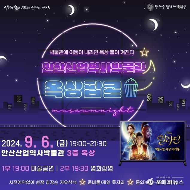 이억배 평생학습과장은 “한여름 밤 화랑유원지가 한눈에 보이는 옥상에서 시민들이 즐거운 시간을 보내길 바란다”라며 “앞으로도 안산산업역사박물관의 콘텐츠를 활용한 다양한 문화 프로그램을 추진하겠다”라고 말했다.