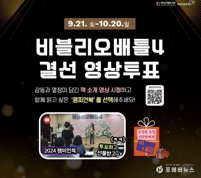 [ 포에버뉴스 김경순 기자 ] 화성시문화재단 화성시립도서관이 9월 21일부터 10월 20일까지 '제 4회 비블리오 배틀' 결선 영상투표를 실시한다.